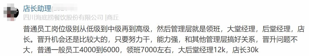 海底捞员工原话:普通员工岗位级别从低级到中级再到高级,然后管理层就是领班,大堂经理,后堂经理,店长。晋升机会还是比较大的,只要努力干,能力强,和其他管理层搞好关系,晋升问题不大