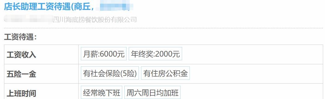 第五位自曝薪酬的,是海底捞的店长助理,他的月薪是6K,年终奖2K,有五险一金,工作日经常晚下班,周末要加班