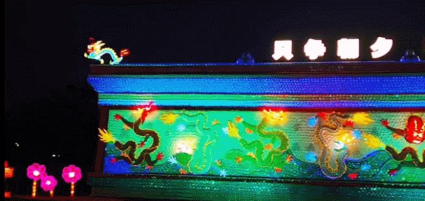 一入园博园东门,面前便是本届灯会中最特别的一组灯“九龙壁”。落眼一瞧,一件件精美的瓷器,玲珑剔透,华光异彩。大小不一的盆、盘、碗、酒杯、茶杯、碟、缸、勺组合成型。