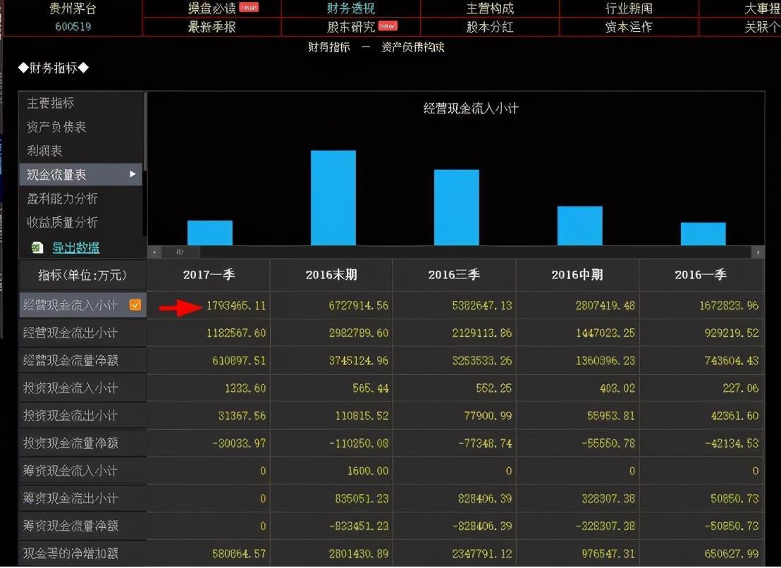 第四看营业利润率,也就是营业利润除以营业收入,这就是营业利润率,这是利润表里最重要的数字了,当然是越大越好。比如茅台毛利率93%,营业利润率达到70%,可以说在中国没有任何一家企业能比茅台还赚钱。看完这四大指标利润表的工作基本就结束了,然后还有最后一步,就是用下面要讲的现金流量表里的经营现金流净额,除以净利润。这个比值越大越好大于1,就是好企业。说白了很好理解,净利润得能变成现金才行。你说你赚了很多钱,得能见到钱摸到钱才行。这就是利润表的全部内容。