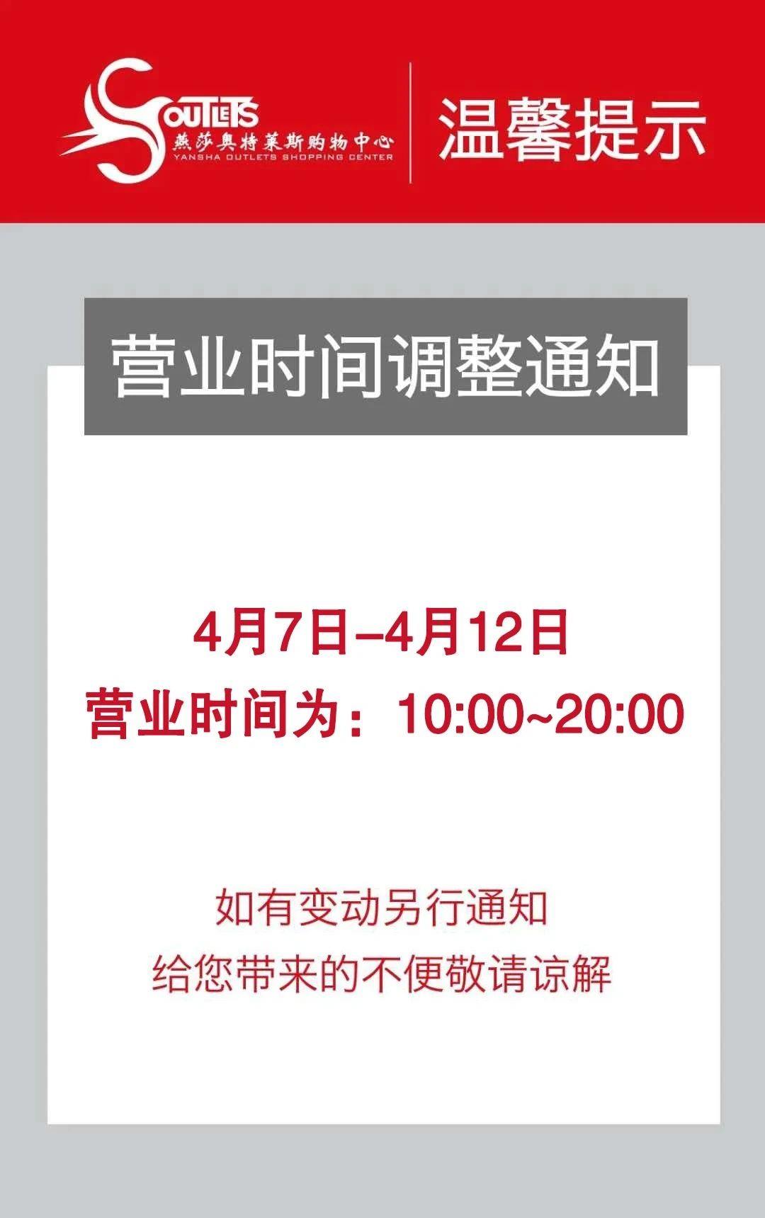 ⚠️燕莎奥特莱斯4月7-4月12日营业时间已调整,近期打算去的小伙伴看准营业时间再行动!