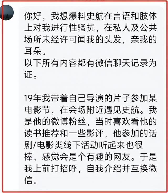4月28日,一女士说2019年自己曾被被史航性骚扰?面对采访,她如此说道:在某一次见面会后我们加了社交账号,谁知道在相处过程中,史航彻底的暴露了本性,语言越来越轻浮,不断聊骚。
