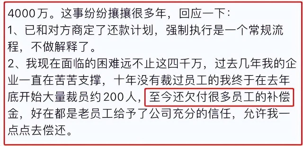 然而,其玩弄舆论的形象早已深入人心。这4000万欠了这么多年,怎么借此事才提还款计划?这显然是故意卖惨,想博个同情再凭借流量大赚一笔。