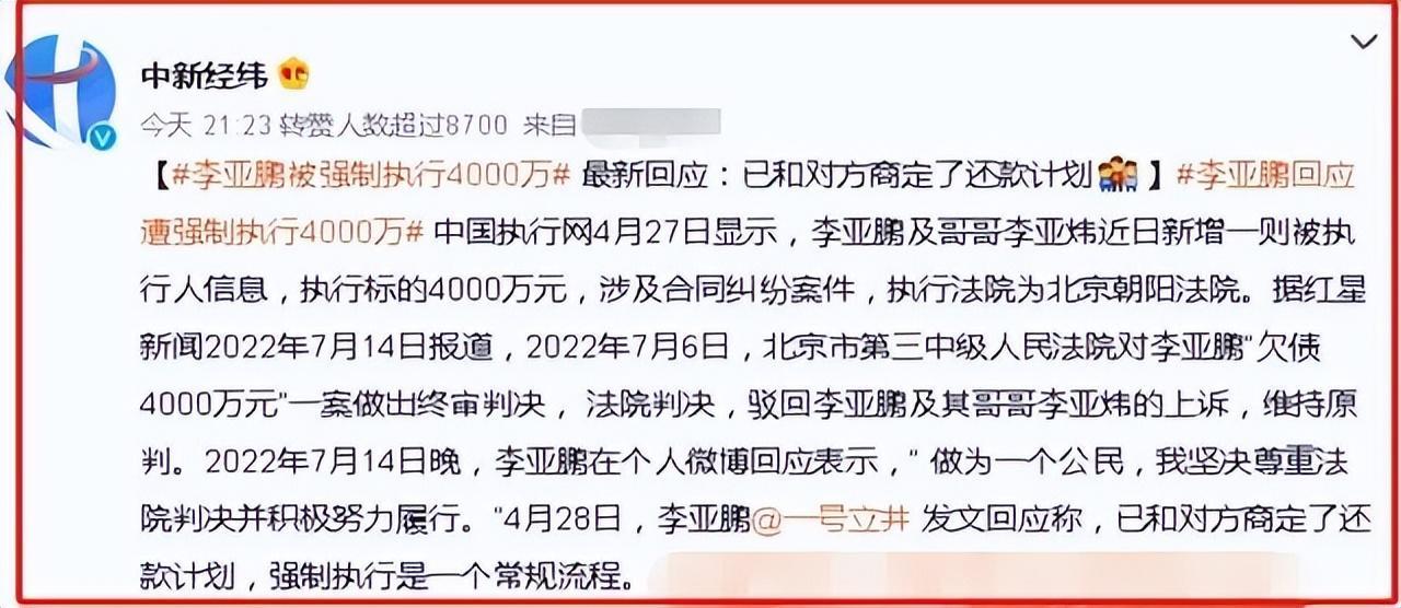 五、李亚鹏又欠债4000万?这次还卖惨求同情吗?