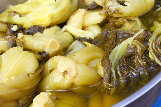 下午,大家把大白菜也都起回来了,心包的好的,连根子拔回来,晒两天就下菜窖。其余的全部腌制酸菜,户里买了3个大泥缸,晚饭后大家齐动手,烧起四个锅,把修理好的白菜用开水焯了,一层层码到大缸里。