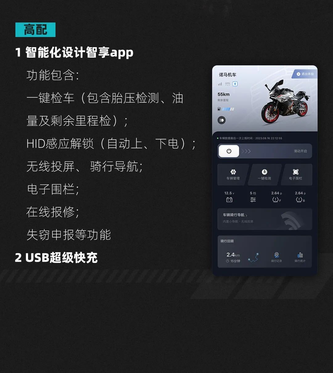 极影325S装备了智能车机系统, 配备5英寸TFT仪表盘、标配蓝牙/WIFI连接和导航投屏功能等,并且高配版搭载了智能化设计智享app功能包含:一键检车(包含胎压检测、油量及剩余里程检)HID感应解锁(自动上、下电)无线投屏、 骑行导航,电子围栏在线报修失窃申报等功能。