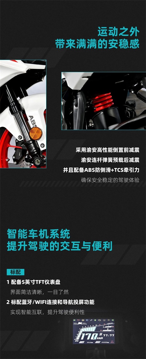 动力方面,极影325S搭载自主研发的325cc的水冷异步双缸八气门发动机最大功率28.7Kw峰值扭矩27.5N.m,零百加速可达 5.1s最高极速可达170km/h,相比同为2W以下售价的凯越刺鸟250RR(未上市猜测价格18900-19800元区间)更据摩托范上已知参数最大功率24Kw,最大扭矩22.5N.m零百加速7.3S最高极速160KM/h。所以从数据上来看,极影325S对比其他入门级仿赛的单缸和双缸动力,排量更大,功率更高。这里可能会有人质疑为啥小编拿250CC和325CC对比,根本不是一个级别有点欺负人。这里我想表达的是2万以下售价,为啥不选择排量更大的呢?安全配置方面极影325S搭载了渝安高性能倒置前减震,渝安连杆弹簧预载后减震并且配备ABS防侧滑+TCS牵引力。