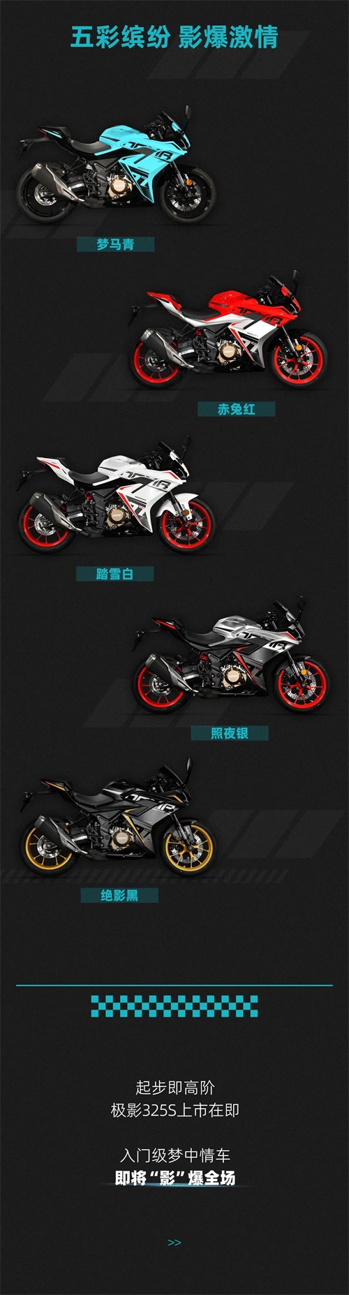 极影325S拥有流畅动感的车身线条,颜色鲜明,漆水质感极佳,且分色设计极具冲击力,完全拿捏住了精致小跑的战斗外观,并且提供了5种车身颜色可选三围尺寸1975X740X1100mm。极影325S整备质量仅为151kg,提升操控灵活性,整车宽度740mm坐高770mm,更佳的骑行夹角,让翻身更加灵活。
