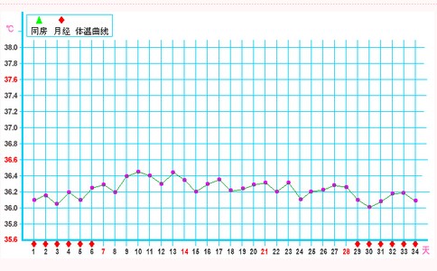 图示为没有排卵的基础体温曲线图,持续低温,没有高温期,没有形成高低温双相变化,如果是测量发现有如图示的姐妹需要到医院就诊,检查是什么原因造成没有排卵,以便对症下药,及早治愈!