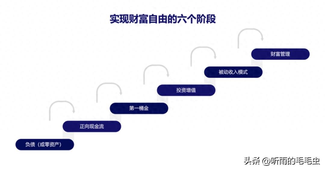 从负债(零资产)到最终实现财富自由,需要跨越六个阶段:负(零)资产、正现金流、第一桶金、投资增值、被动收入和财富管理。