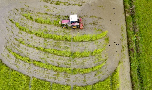 3月25日,在江西省新余市欧里镇木村,耕作的农机和成群觅食的飞鸟构成美丽春耕图(无人机照片)。 新华社发(赵春亮摄)