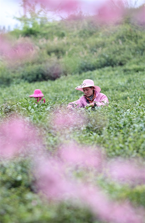 3月25日,茶农在贵州省黔东南苗族侗族自治州丹寨县兴仁镇烧茶村的茶园采摘明前茶。 新华社发(黄晓海摄)