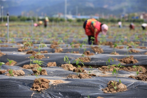 3月25日,在贵州省黔东南苗族侗族自治州榕江县车江大坝蔬菜基地,农民在栽种辣椒苗。 新华社发(杨文舒摄)
