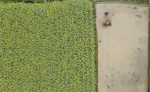 3月25日,重庆市秀山县土家族苗族自治县溶溪镇柳水村的村民在耕田(无人机照片)。 新华社发(胡程摄)