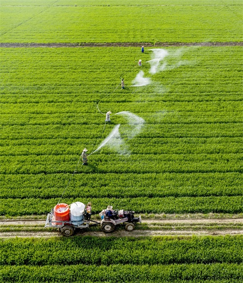 3月24日,在安徽省合肥市庐江县白湖镇现代农业示范基地,农民进行小麦赤霉病防治作业。 新华社发(左学长摄)
