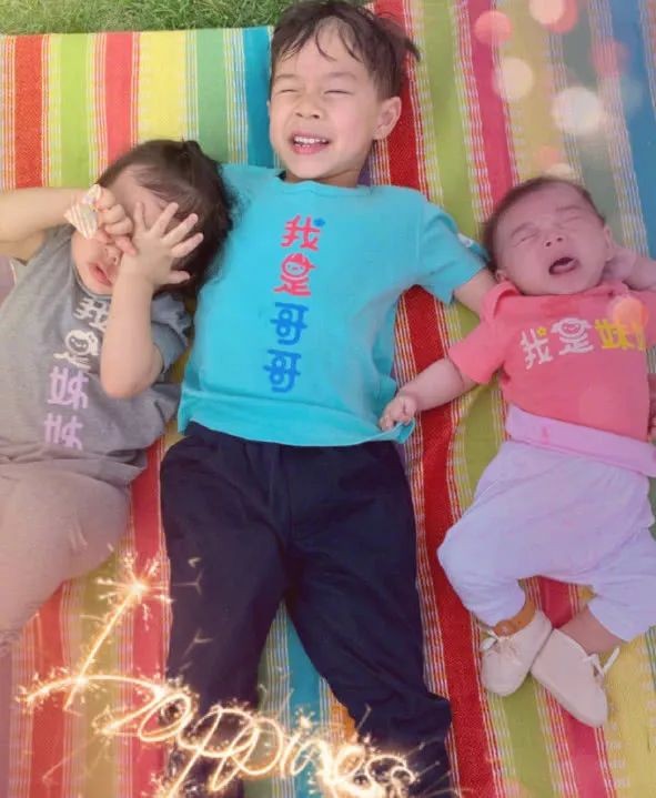 照片中,哥哥揽着两个妹妹开怀大笑,十分温馨可爱。