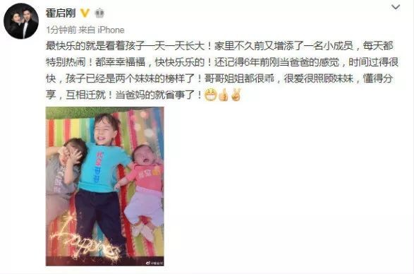 昨天(26日)下午,霍启刚在微博晒出三个孩子的合影,正式宣布妻子郭晶晶三胎产女的喜讯。