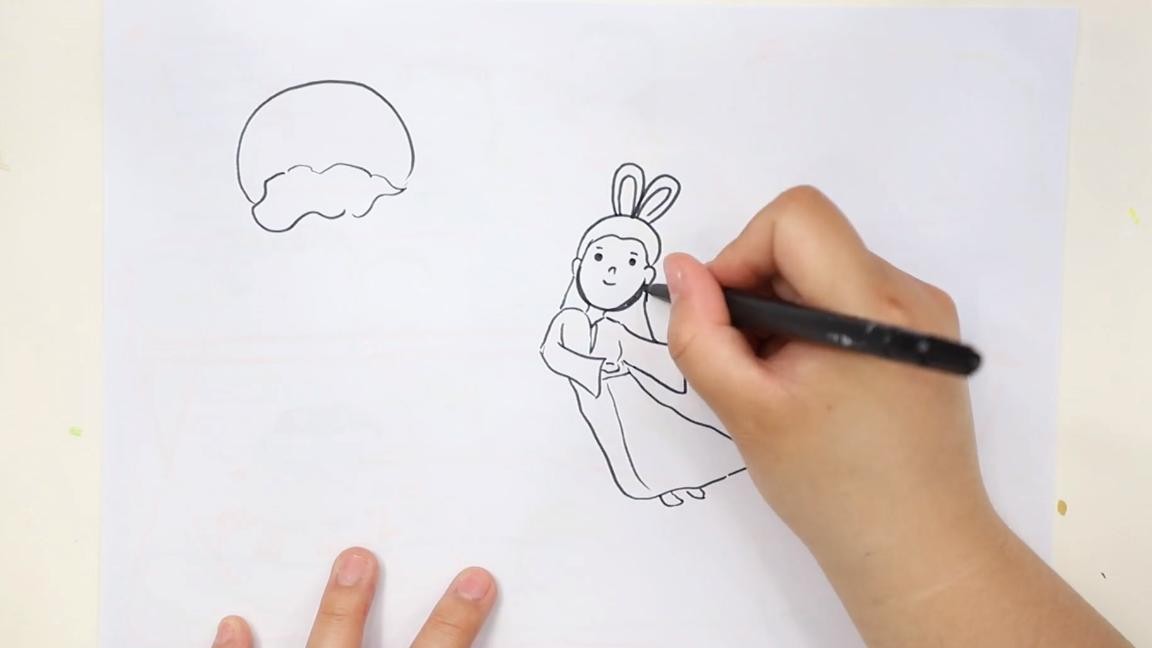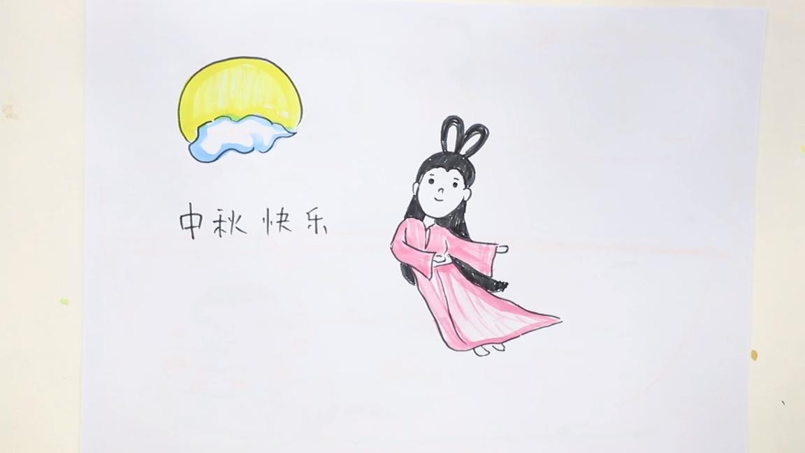 步骤②开始上色,将嫦娥头发涂上黑色,裙子涂上粉红色,月亮和云朵涂上黄色蓝色,写上中秋快乐。