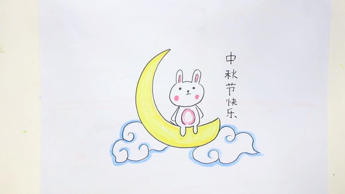 画法1:步骤①画上玉兔、云朵和月亮,写上中秋节快乐;