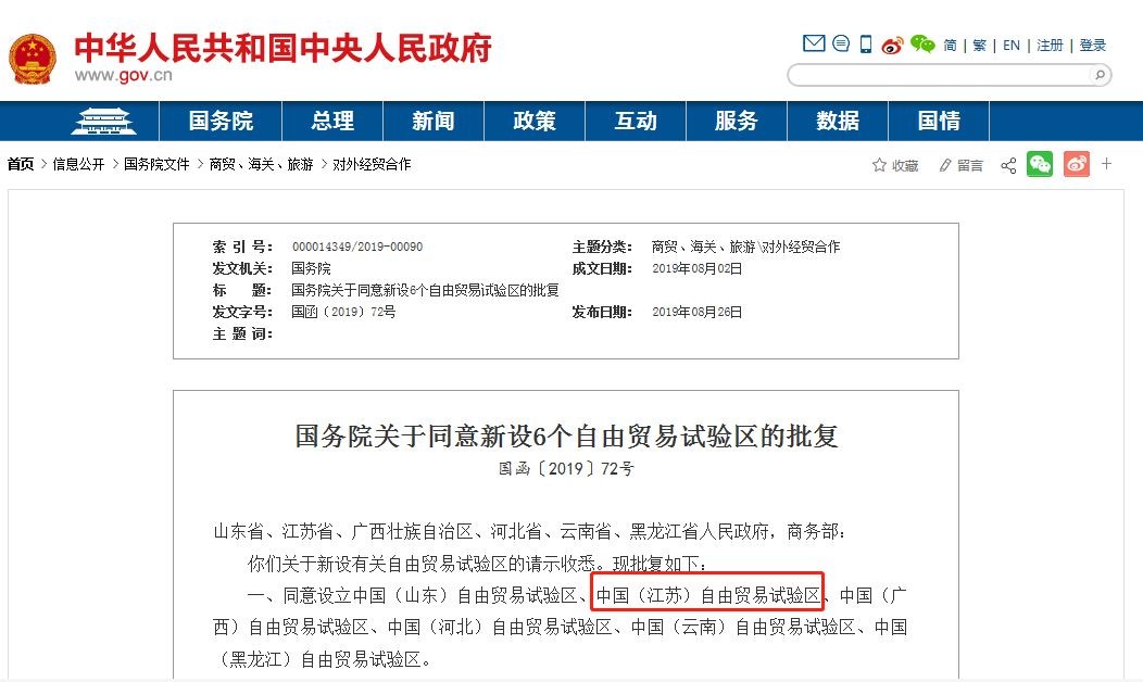 昨天中国政府网发文国务院同意设立中国(江苏)自由贸易试验区