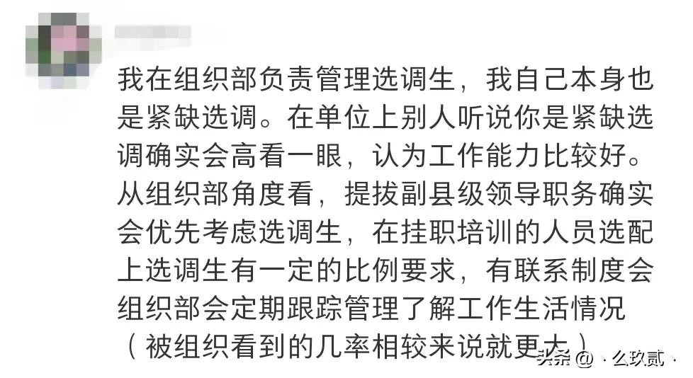 我在组织部负责管理选调生,我自己本身也是紧缺选调。在单位上别人听说你是紧缺选调确实会高看一眼,认为工作能力比较好。从组织部角度看,提拔副县级领导职务确实会优先考虑选调生,在挂职培训的人员选配上选调生有一定的比例要求,有联系制度会组织部会定期跟踪管理了解工作生活情况(被组织看到的几率相较来说就更大)