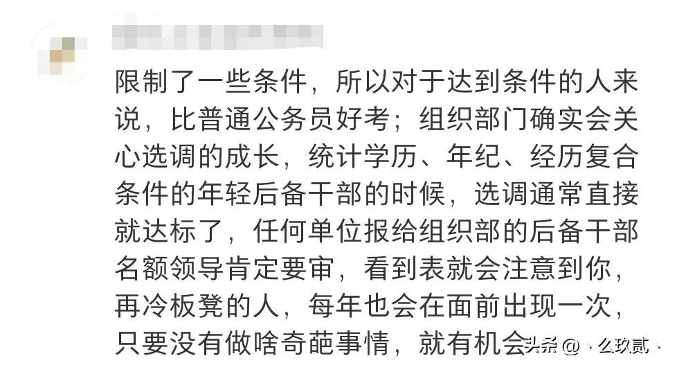 限制了一些条件,所以对于达到条件的人来说,比普通公务员好考;组织部门确实会关心选调的成长,统计学历、年纪、经历复合条件的年轻后备干部的时候,选调通常直接就达标了,任何单位报给组织部的后备干部名额领导肯定要审,看到表就会注意到你,再冷板凳的人,每年也会在面前出现一次,只要没有做啥奇葩事情,就有机会