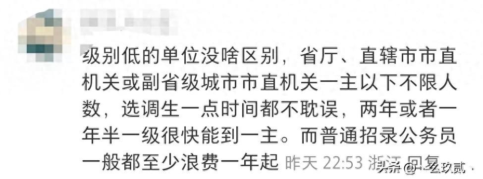 级别低的单位没啥区别,省厅、直辖市市直机关或副省级城市市直机关一主以下不限人数,选调生一点时间都不耽误,两年或者一年半一级很快能到一主。而普通招录公务员一般都至少浪费一年起