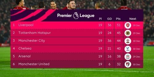 英超2018最新积分榜 英超第19轮最新球队排名情况