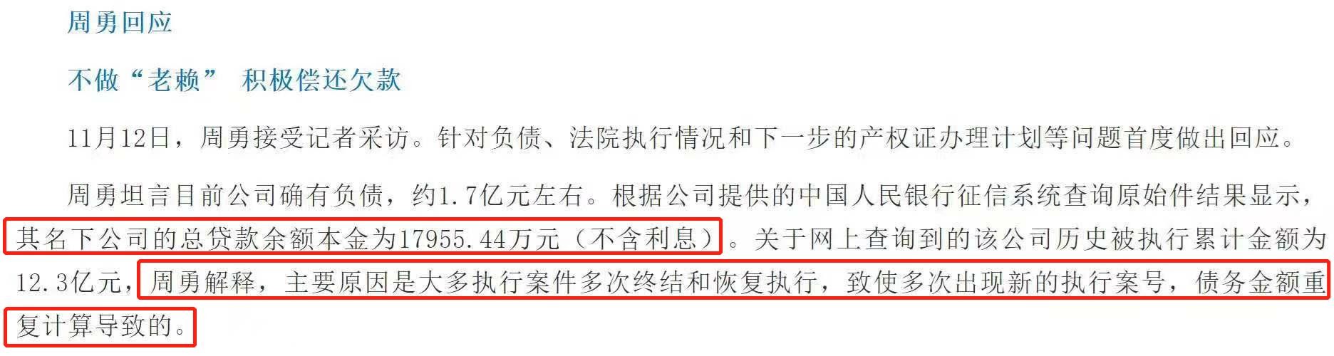 周勇承认公司目前确实是有负债,不过不是网传的12.3亿,而是1.7亿元,根据公司提供的征信系统查询原始件结果显示,周勇名下公司的总贷款余额本金为17955.44万元(不含利息)。