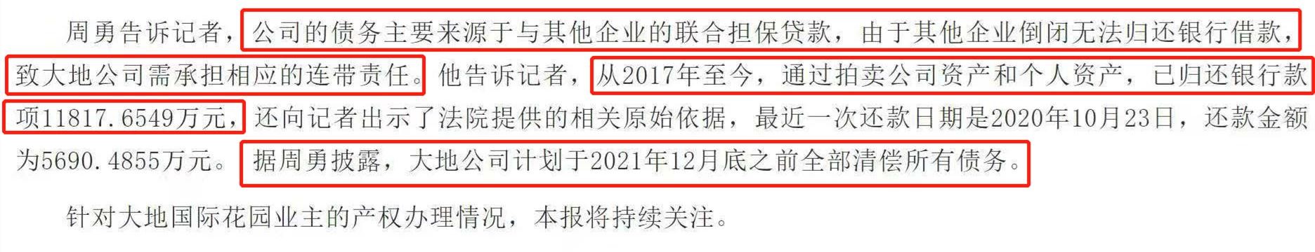 据周勇回应,从2017年至今,已经通过拍卖公司资产和个人资产,归还银行款项11817.6549万元,最后的一次还款日期是2020年10月23日,还款金额为5690.4855万元,周勇还表示大地公司计划于2021年12月底之前全部清偿所有债务。