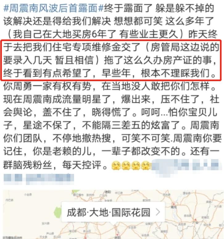 事情曝出后,周震南的父亲把住宅专项维修金交了,不过这并不能减缓大家对他们的愤怒和不满。