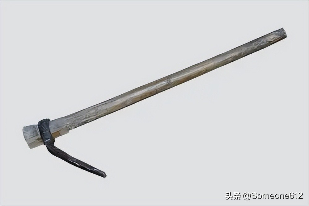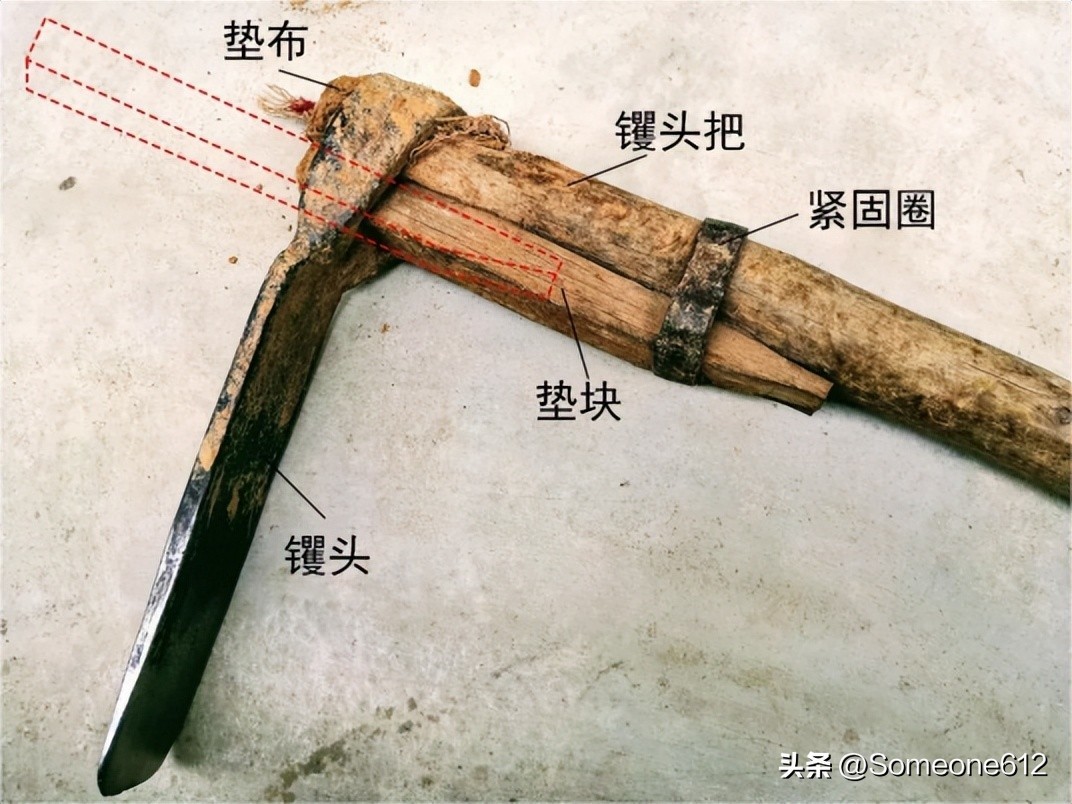 䦆头(jué),现在大多数人都用“镢头”来代替,我们这个地方的方言叫法跟普通话的发音几乎一样,只有镢头尾音处有细微差别。䦆头应该算得上是我们这里农民使用最多的用具之一了。它主要用于农用机械未使用前开荒、翻地松土用,有时也用来挖坑、修水渠、修路用,背面朝下的时候还可以用来砸东西,比如将食用核桃砸成无法食用的粉末状时就很好用(很解压但不建议模仿)。由于九皋镇处于浅山丘陵区,山峦起伏,沟壑纵横,耕地几乎都在山坡上,有的耕地坡度很大,以至于到现在也无法使用千里牛手扶拖拉机翻地,三个人都拉不住,所以在很长一段时间里,这里的农民在都靠它翻地,即便是现在也是农民家里必不可少的农具之一。给大家简单普及一下䦆头组成中的方言叫法(手动捂脸)。