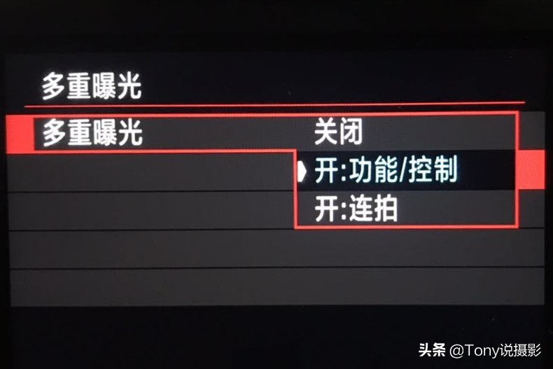 进入多重曝光的设置界面后,我们需要开启多重曝光功能,这时候相机会提供两种开启方式,有不同的运用。