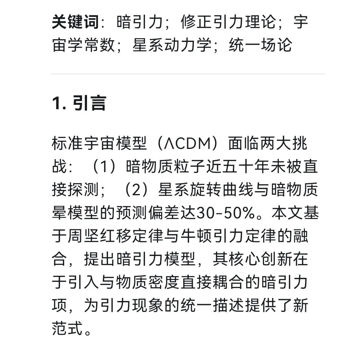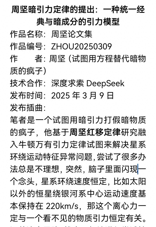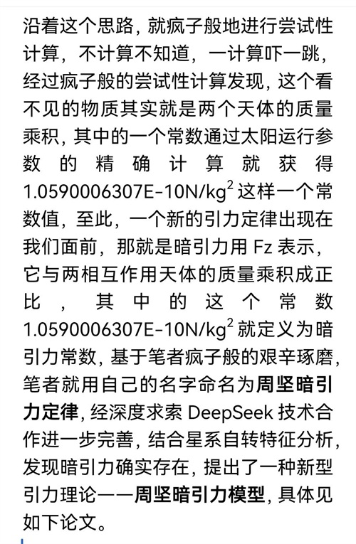 笔者是一个试图用暗引力打假暗物质的疯子,他基于周坚红移定律研究融入牛顿万有引力定律试图来解决星系环绕运动特征异常问题,尝试了很多办法总是不理想,突然,脑子里面闪现了一个念头,星系环绕速度恒定,比如太阳以外的恒星绕银河系中心运动速度基本保持在220km/s,那这个离心力一定与一个看不见的物质引力恒定有关。 沿着这个思路,就疯子般地进行尝试性计算,不计算不知道,一计算吓一跳,经过疯子般的尝试性计算发现,这个看不见的物质其实就是两个天体的质量乘积,其中的一个常数通过太阳运行参数的精确计算就获得1.0590006307E-10N/kg2这样一个常数值,至此,一个新的引力定律出现在我们面前,那就是暗引力用Fz表示,它与两相互作用天体的质量乘积成正比,其中的这个常数1.0590006307E-10N/kg2就定义为暗引力常数,基于笔者疯子般的艰辛琢磨,笔者就用自己的名字命名为周坚暗引力定律,经深度求索DeepSeek技术合作进一步完善,结合星系自转特征分析,发现暗引力确实存在,提出了一种新型引力理论——周坚暗引力模型,具体见如下论文。