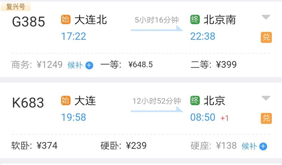 这个方案适合晚上出发的人,票价只要150多。适合没法赶上晚上大连直达北京普速列车的人。