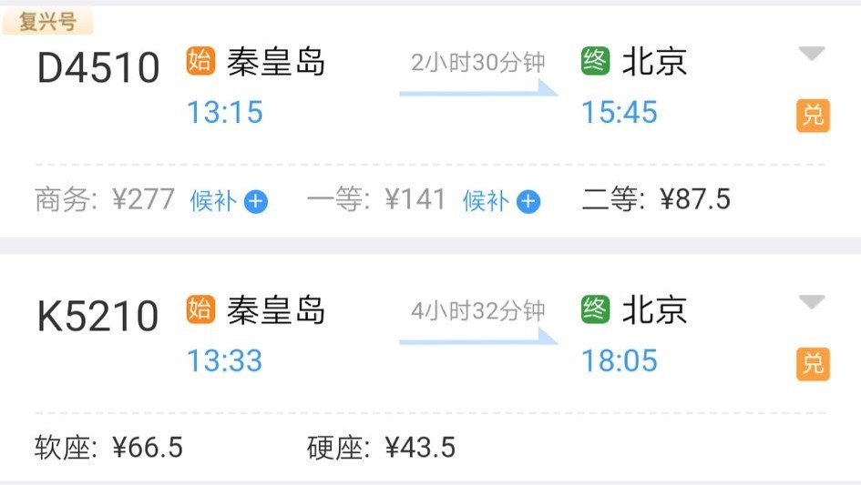 坐G1251次在秦皇岛站换D4510次列车到北京,包括中转用时也在7小时内。票价最低只要316块5。