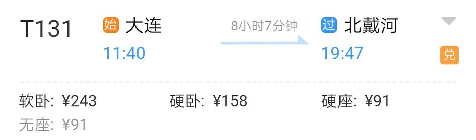 方案3:在大连火车站乘坐T131次到北戴河火车站,换乘T5700次列车到北京站。