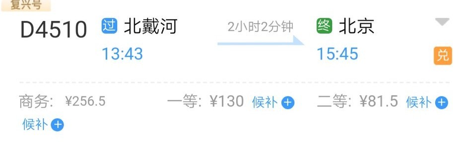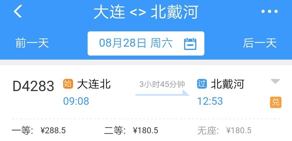 方案2:在大连北站乘坐D4283次列车到北戴河火车站,换乘D4510次列车到北京站。