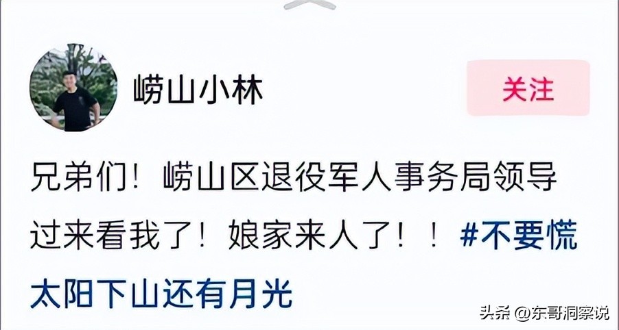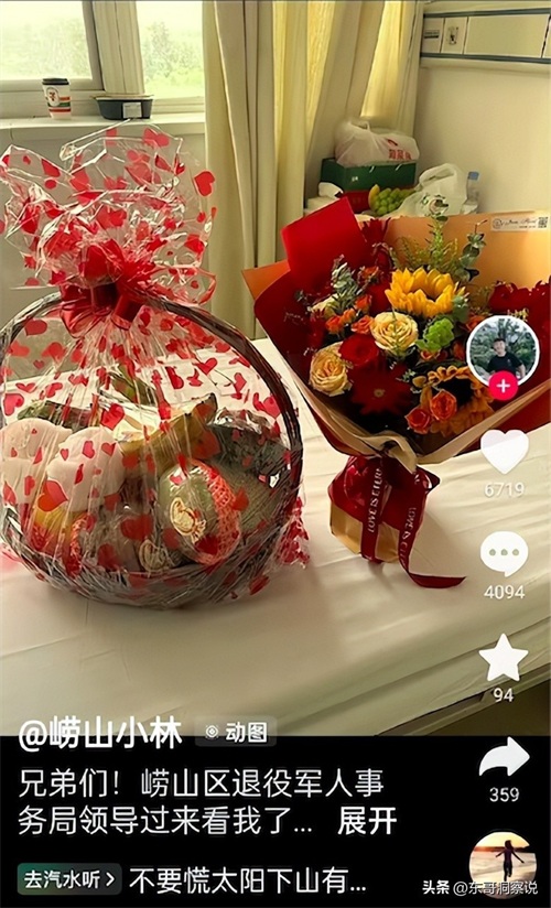 崂山小林在平台上说,“兄弟们!崂山区退役军人事务局领导过来看我了,娘家来人了!!”