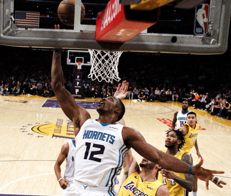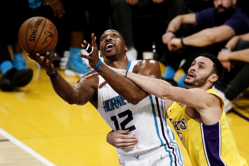 2018年1月6日,时为黄蜂球员的霍华德(左)在与湖人的比赛中上篮。新华社发