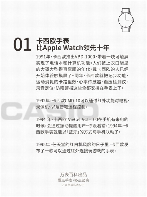 1991年,卡西欧推出VBD-1000,可触屏实现了电话本和计算机功能。人们被上衣口袋里的大哥大坠得直弯腰的年代,戴卡西欧的人已经开始体验触摸屏了。同年,卡西欧就把记步功能、运动消耗的卡路里数、心率传感器、血压检测仪、录音定位、防晒警报这些全都安排在手表上了。