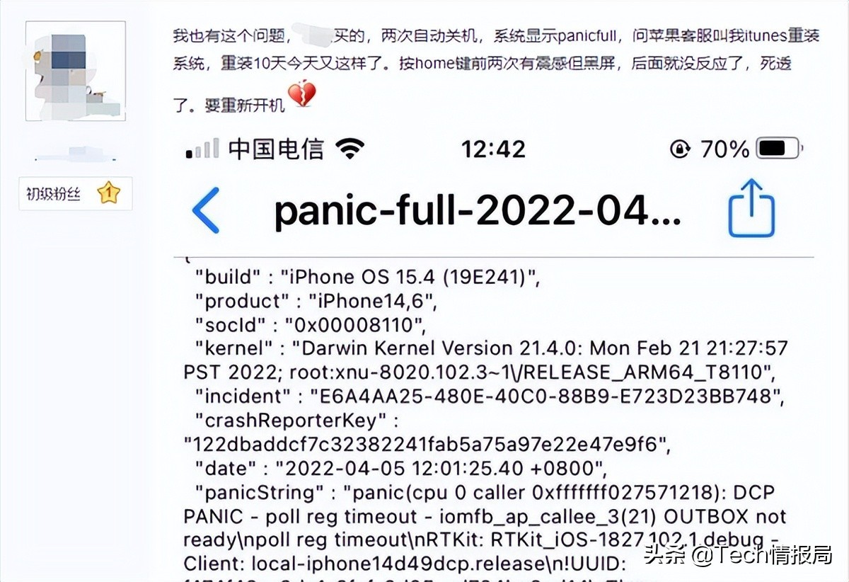 不仅仅是个例,同样在其他论坛上也有众多用户反馈称也遇到了相同状况。两次自动关机后手机界面会出现一连串的“panic full”代码报错,即便是通过询问苹果客服后重装iOS系统也一样无法解决。