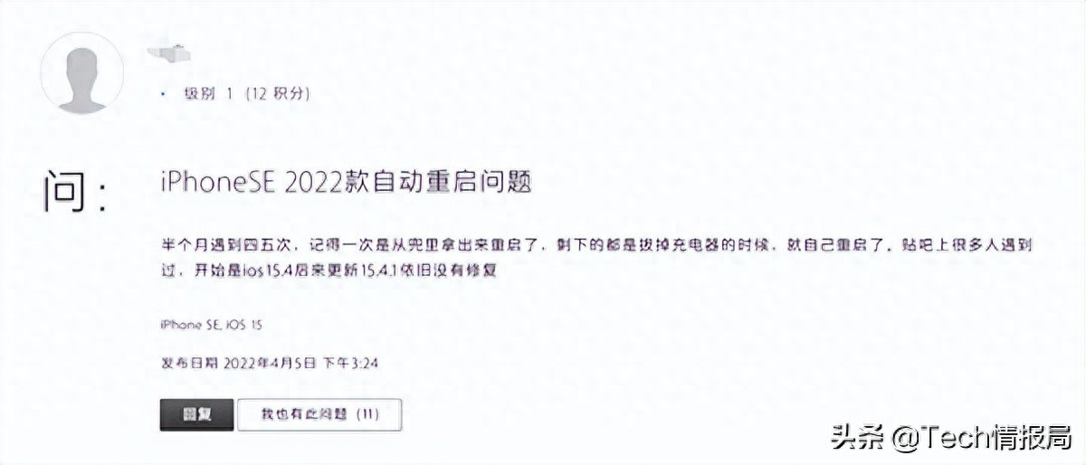 然而,近期有真实用户反映称,自己正在使用的iPhone SE3疑似“翻车”,会出现无故自动重启现象。该国行用户在苹果官网反馈称:“自己半个月都遇到四五次,并且系统从iOS15.4升级到iOS15.4.1也没有得到修复。”