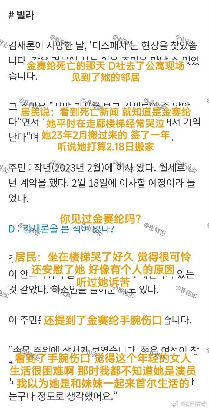 3、在金赛纶去世当天,D is社记者曾前往现场采访了同一栋楼的邻居,邻居称“她经常在走廊和楼梯上哭泣,所以我对她有印象。”还说有一次看到金赛纶坐在楼梯上哭了很久,以及她的手腕周围有伤痕。