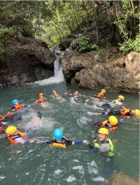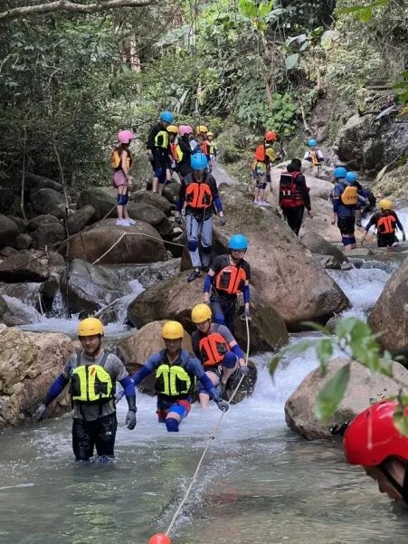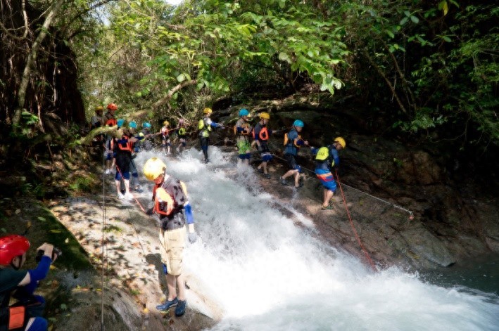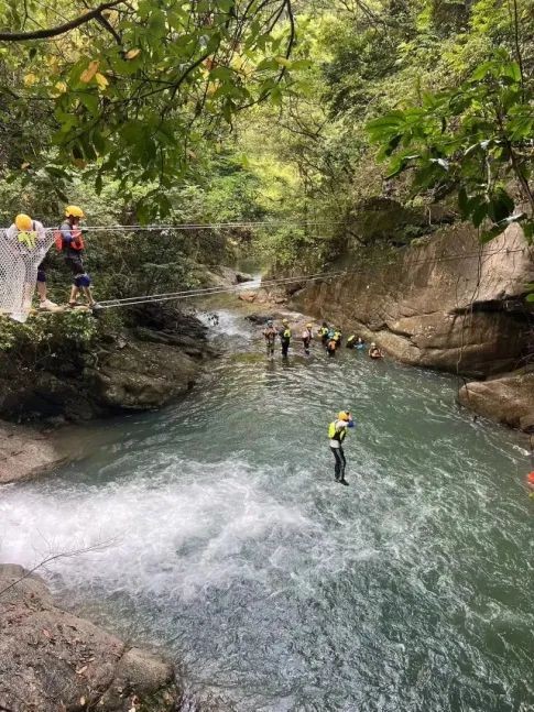 除囊括普通溪降具有的瀑布滑降、天然滑梯、 攀岩、悬岩跳水等项目外,目前推出了极具创意的丛林穿跃、水上蹦床、悬 桥空中跳台等一批网红打卡新玩法。丛林飞跃设计在原始森林和溪谷中将水、 陆、空的游玩乐趣完美结合。