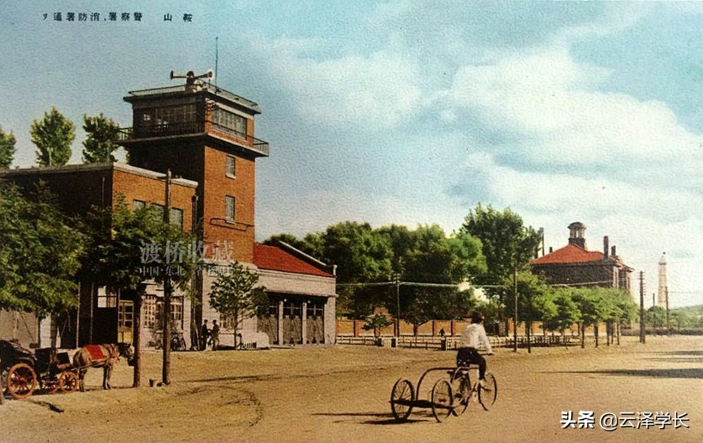 日伪时期的鞍山消防队(左)和站前的警察署、电塔(右)