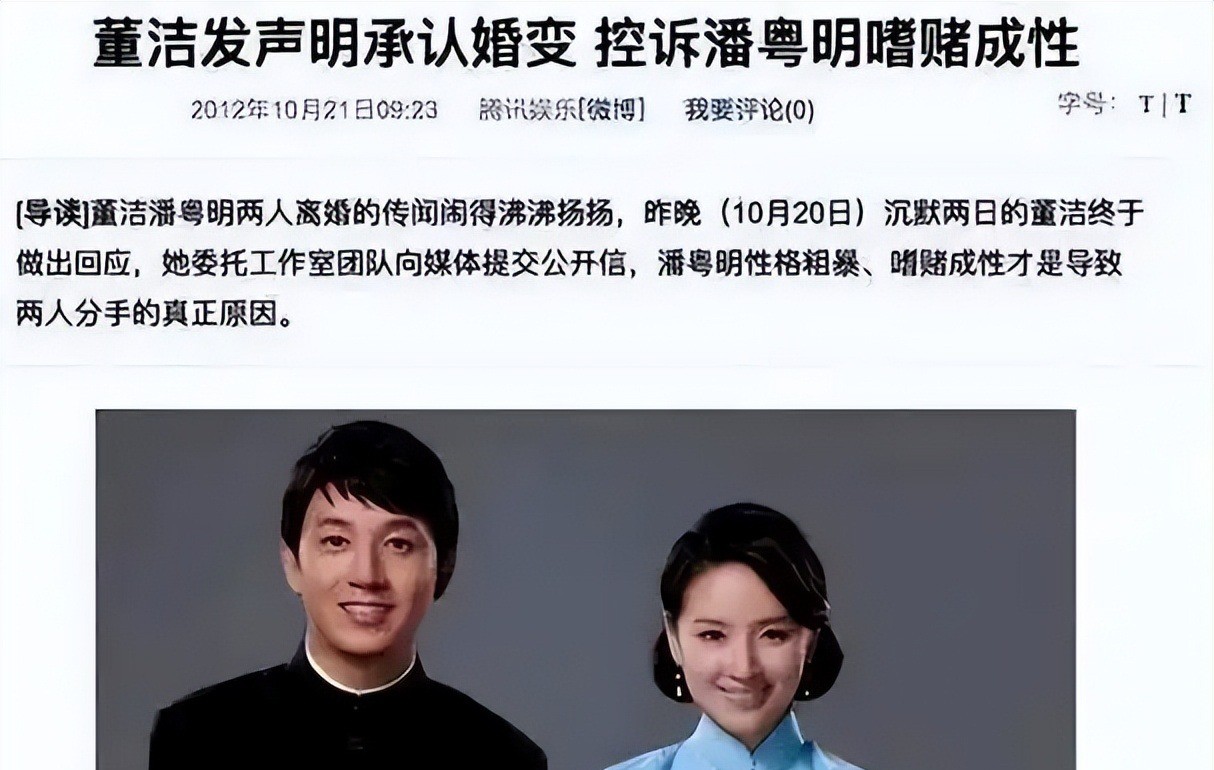 2012年,董洁工作室突然发布声明,宣布与潘粤明离婚,并指责他嗜赌成性,欠债累累,对家庭不负责任。