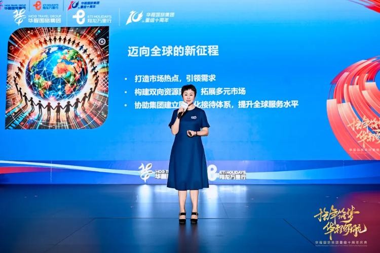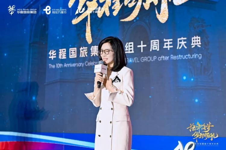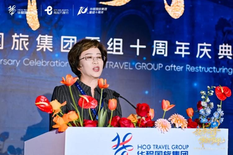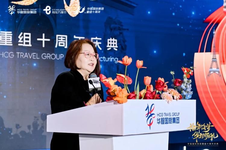 中国旅行社协会副会长兼秘书长孙桂珍为庆典致辞。“作为中国旅行社协会副会长单位,华程国旅集团积极履行职责,充分发挥自身在出境旅游行业领跑者优势,推动行业发展、整合行业资源、促进产品创新和品质服务。期待华程国旅集团在接下来的十年中继续蓬勃发展、领航市场,在推动旅行社转型升级和高质量发展中作出新的贡献。”