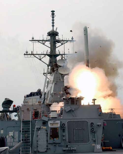 从水面舰艇的MK41 垂发系统发射升空的“战斧”导弹
