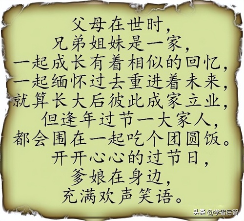 “父母在,兄弟姐妹是一家,父母去,兄弟姐妹是亲戚”。